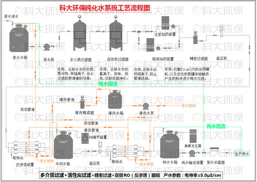 原水→原水泵→多介質過濾器→活性炭過濾器→阻垢加藥裝置→還原加藥裝置→精密過濾器→一級高壓泵→一級級反滲透 →PH調節→中間水箱→二級高壓泵→二級反滲透(反滲透膜表面帶正電荷)→純化水箱→臭氧發生器→純水輸送泵→紫外線殺菌器→用水點